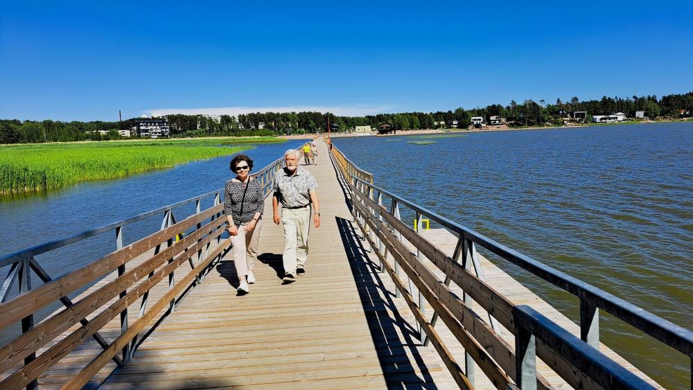 Aluksi kävelysiltaa pitkin meren lahden ylitys, sitten puukorttelien lomitse kohti Loviisan kirkkoa.