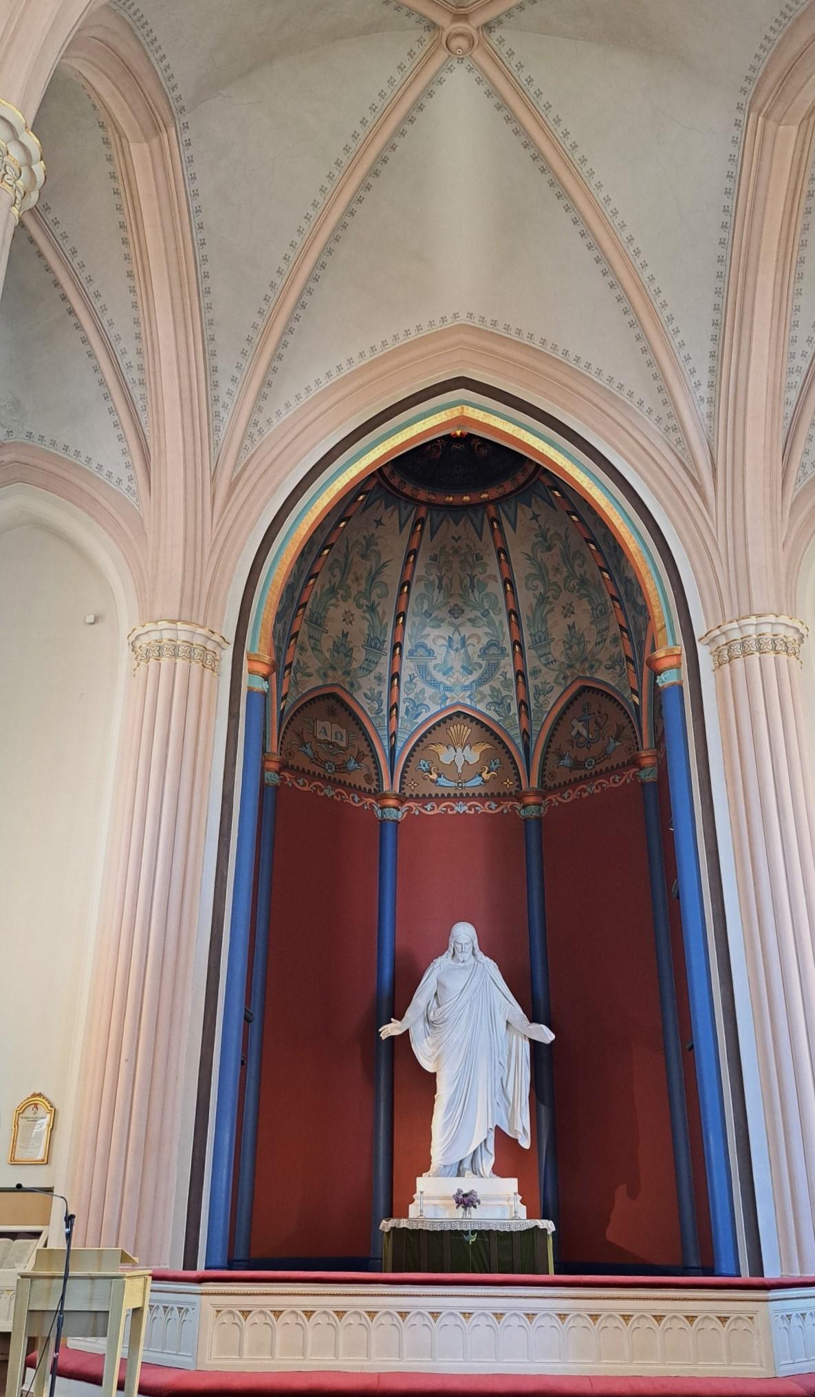 Kirkko valmistui vuonna 1865. Erikoisuutena, alttaritaulu on korvattu Kristus-patsaalla, joka on kipsijäljennös tanskalaisen Bertel Thorvaldsenin teoksesta vuodelta 1839.