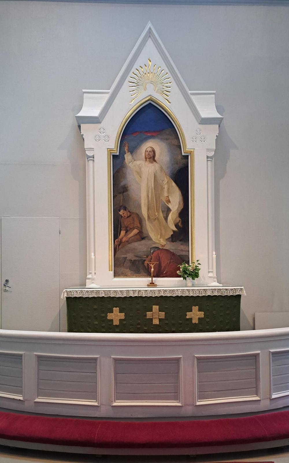 Seuraava kohde Strömforsin ruukki. Tutustuminen alkoi puukirkosta ruukin etelälaidalla, joka valmistui vuonna 1770. Alttaritaulun nimi on Ylösnousemus ja sen on maalannut Helene Schjerfbeck vuonna 1898. Teos on hänen ainoa alttarimaalaus.